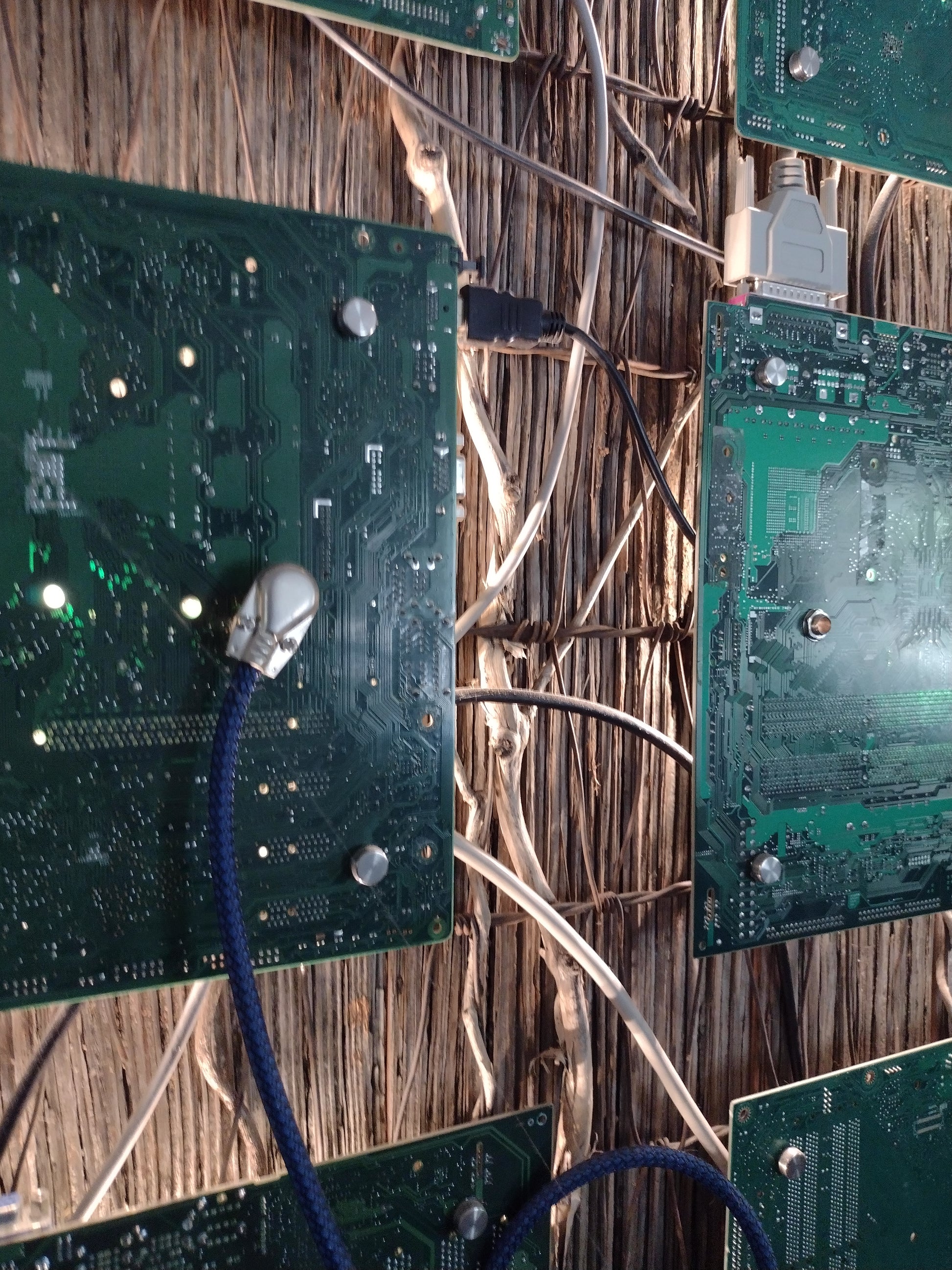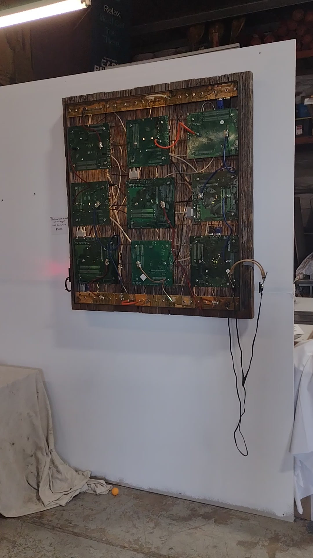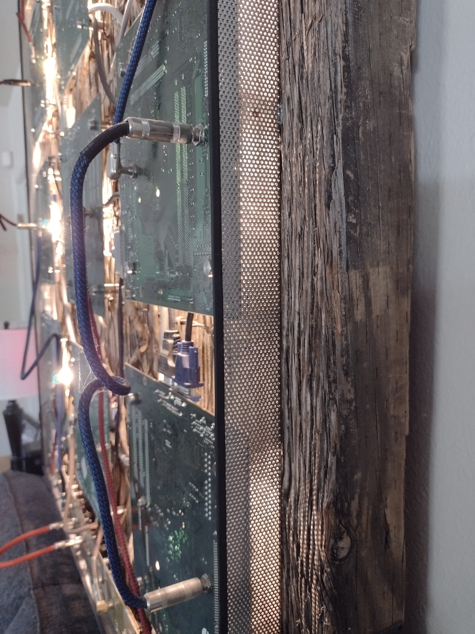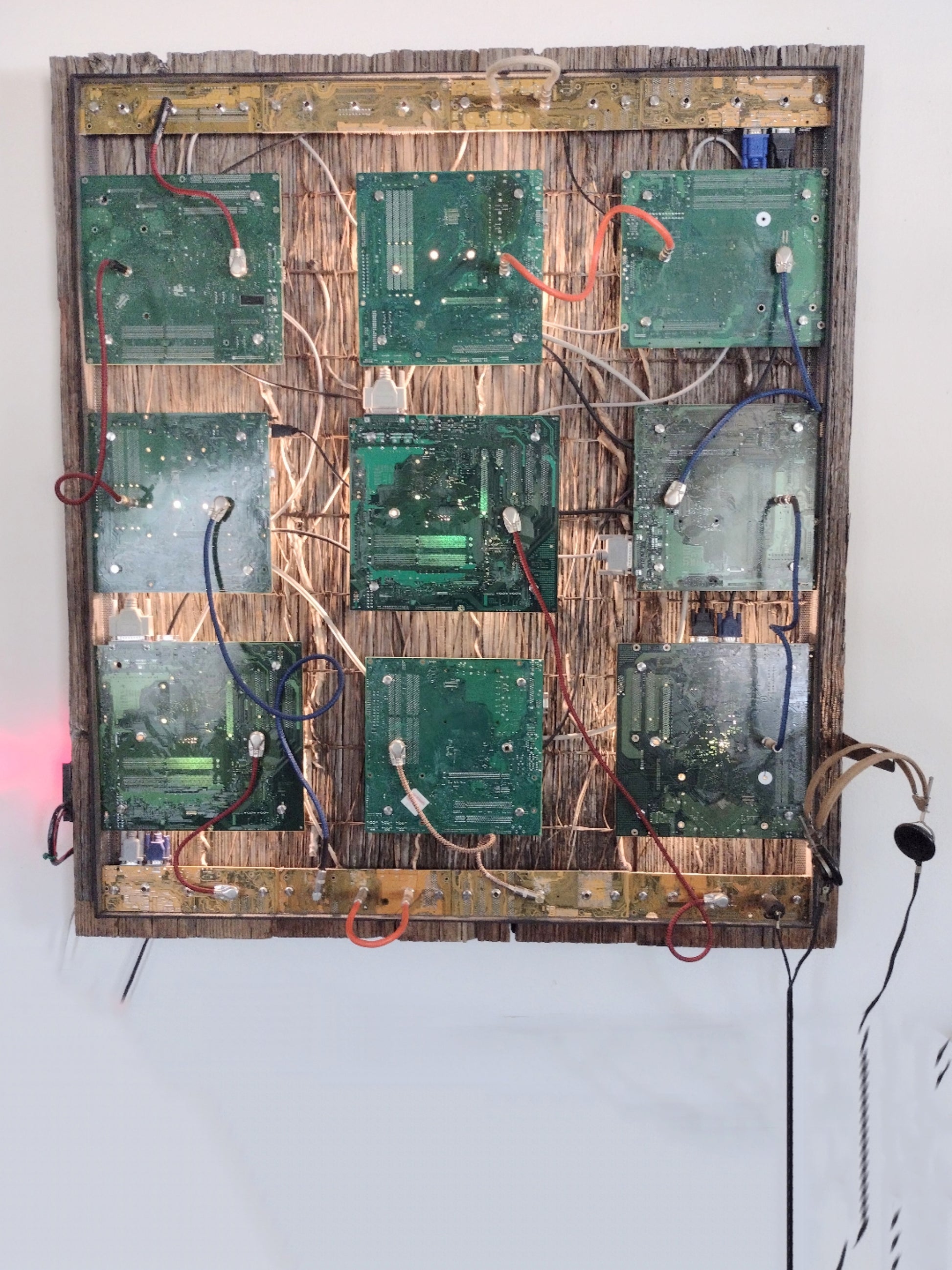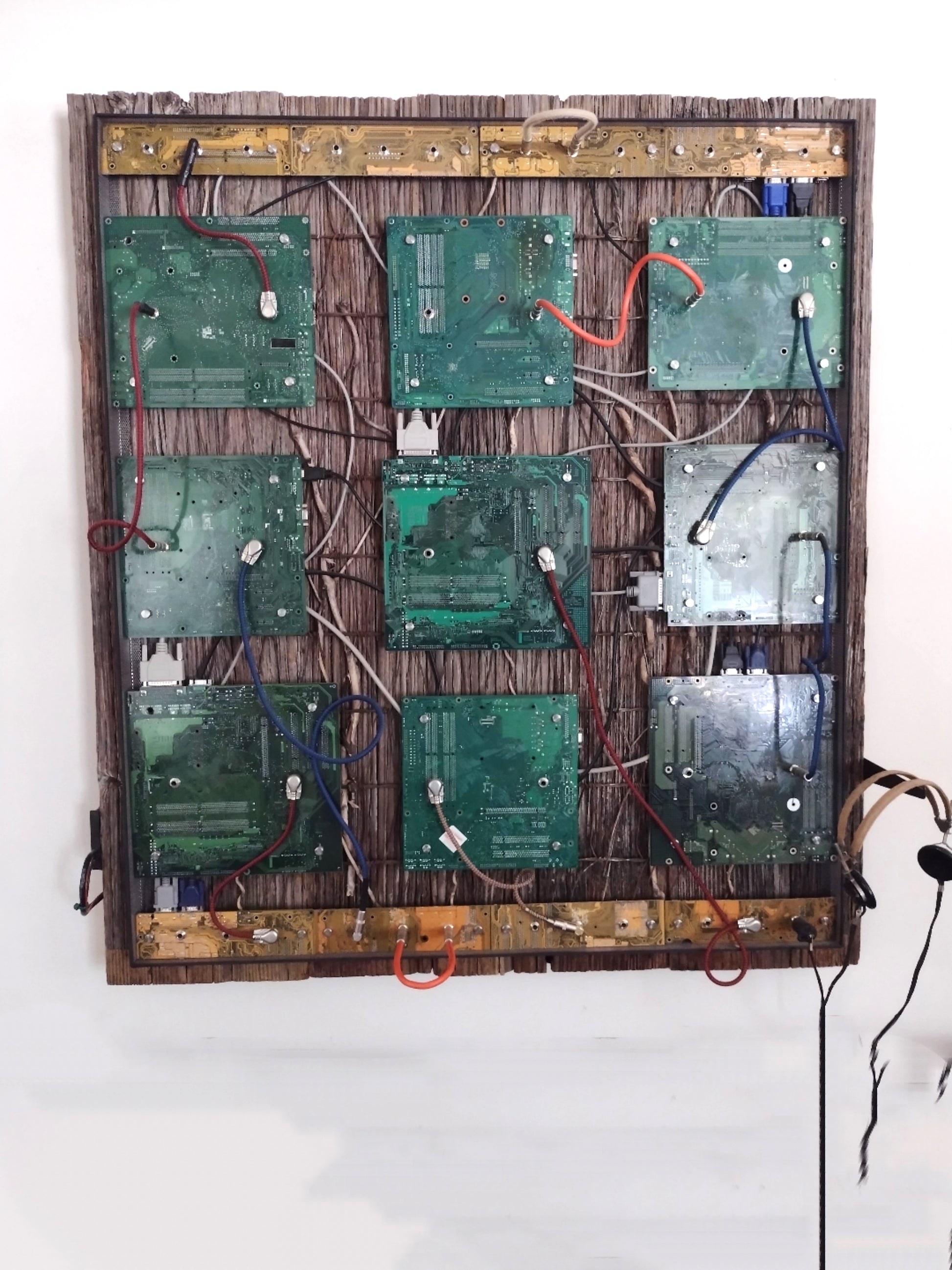So that makes me wonder what thoughts of ours are natural ( thoughts any human would have) which is represented by the wood. Which of our thoughts are a product of environment represented by the plastic mother boards. The two together represents the worlds we were born into. At first it was a natural world and increasingly a world shaped by our making. How does our environment affect our thinking? Which is more dominant, nature vs. nurture?